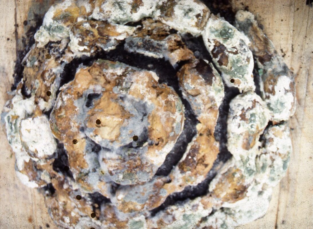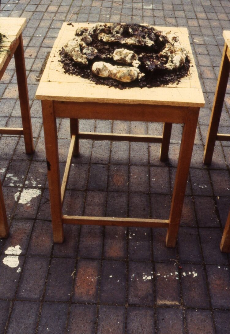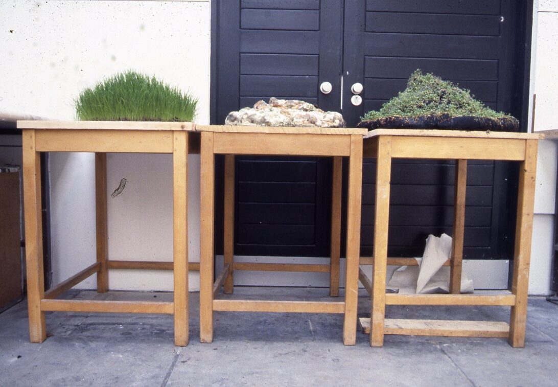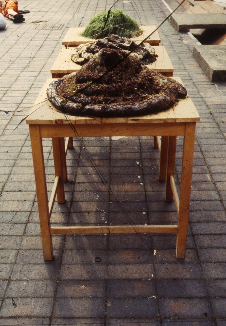 Open studio work, Nottingham 1994: Circular mounds of grass seed on earth, bread rolls watered with milk and cress seeds on newspaper coils were encouraged over a number of weeks to follow their natural cycles of growth and decay. Copper conducting wire threaded through each mound representing the energy involved the natural process.